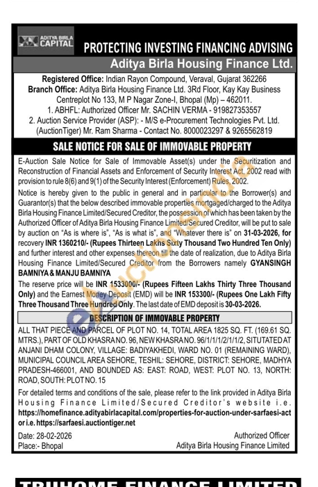 ALL THAT PIECE AND PARCEL OF PLOT NO. 14, TOTAL AREA 1825 SQ. FT. (169.61 SQ. MTRS.), PART OF OLD KHASRANO, 96, NEW KHASRA NO. 96/1/1/1/2/1/1/2, SITUTATEDAT ANJANI DHAM COLONY, VILLAGE: BADIYAKHEDI, WARD NO. 01 (REMAINING WARD), MUNICIPAL COUNCIL AREA SEHORE, TESHIL: SEHORE, DISTRICT: SEHORE, MADHYA PRADESH-466001, AND BOUNDED AS: EAST: ROAD, WEST: PLOT NO. 13, NORTH: ROAD, SOUTH: PLOT NO. 15