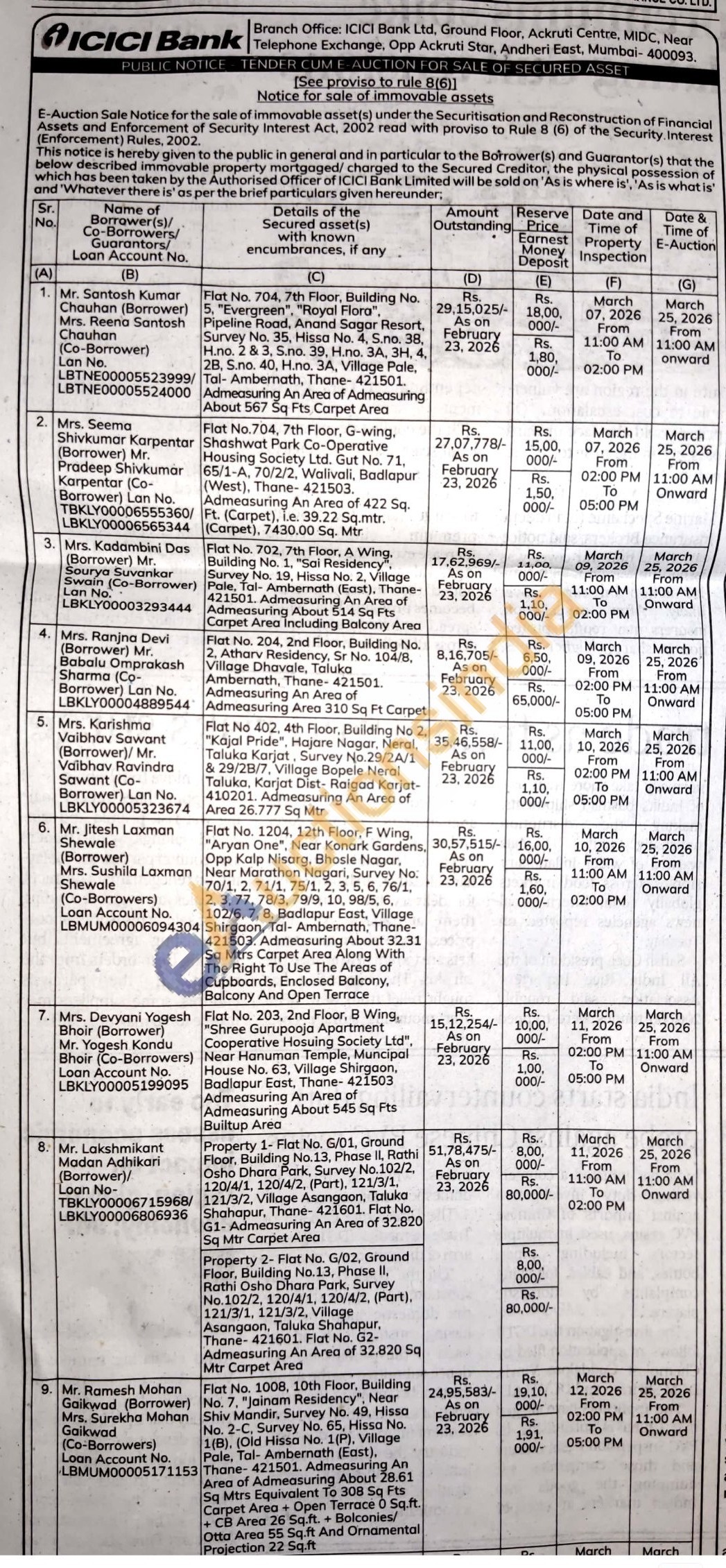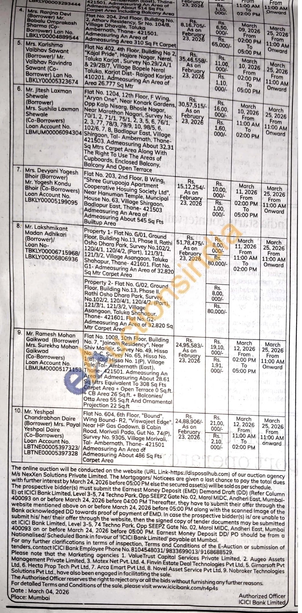 Flat No. 1008, 10th Floor, Building No. 7. "Jainam Residency". Near Shiv Mandir, Survey No. 49, Hissa No. 2-C, Survey No. 65, Hissa No. 1(B), (Old Hissa No. 1(P), Village Pale, Tal- Ambernath (East). Thane-421501. Admeasuring An Area of Admeasuring About 28.61 Sq Mtrs Equivalent To 308 Sq Fts Carpet Area + Open Terrace 0 Sq.ft. +CB Area 26 Sq.ft. + Bolconies/Otta Area 55 Sq.ft And Ornamental Projection 22 Sq.ft