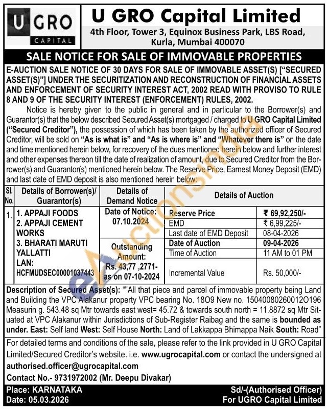 Description of Secured Asset(s): ""All that piece and parcel of immovable property being Land and Building the VPC Alakanur property VPC bearing No. 1809 New no. 150400802600120196 Measurin g. 543.48 sq Mtr towards east west= 45.72 & towards south north = 11.8872 sq Mtr Sit-uated at VPC Alakanur within Jurisdictions of Sub-Register Raibag and the same is bounded as under. East: Self land West: Self House North: Land of Lakkappa Bhimappa Naik South: Road"