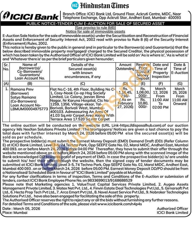 Flat No.C-16, 4th Floor, Building No C-1, Cosy-Nook Co-op Hsg Society Limited, Lic Colony, Jeevan Bima Nagar, Nr Karuna Hospital, Cts No 1259, 1356, Village-eksar, Tal-Borivali, Borivali West, Mumbai-400103. Admeasuring An Area Of 41.03 Sq.mtr Carpet Area Along With Terrace Area 17.520 Sq.mtr Carpet