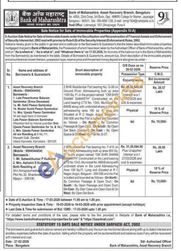 2 BHK residential Flat bearing No. F-410 on 4th Floor, Admeasuring built up area 950 Sq. FL in the project named "OM SHRI SWAMI SAMARTH Constructed on the Land bearing CTS No. 1343, Municipal No. 689/8 along with undivided share in the Land Admeasuring Area 100 Sq.Ft. Lying and Situated at RC Nagar, Angol, Belgaum-590006 and the Flat is butted and bounded as follows-On North: By Common Passage & Open Duct. On South By Open Passage and Open Duct On East: By Stair Case and Open Duct & On West: By Open Set Back.
