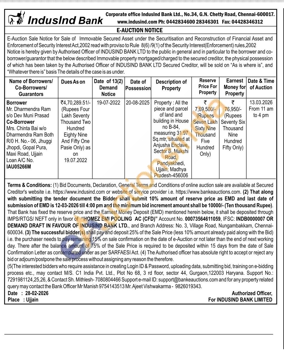 Property: All thepiece and parcel of land and building in House no B-84, measuring 31.97 Sq.mtr, situated at Anjusha Enclave, Sector B. Makshi Road, Pandyakhedi, Ujjain, Madhya Pradesh-456006