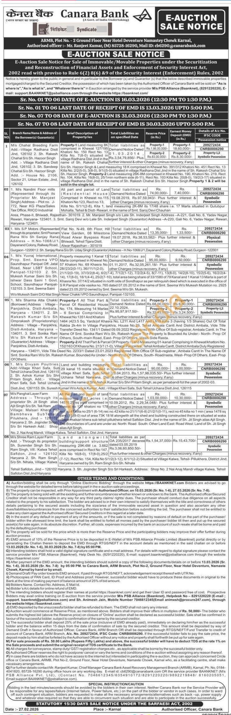 Land and building measuring 29 kanal 15 marla situated in village Kheri Safa, Sub Tehsil Uchana Tehsil Narwana, Dist Jind in the name of Shri Ashok Kumar S/o Shri Pritam Singh, as per jamabandi fot the year of 2002-03