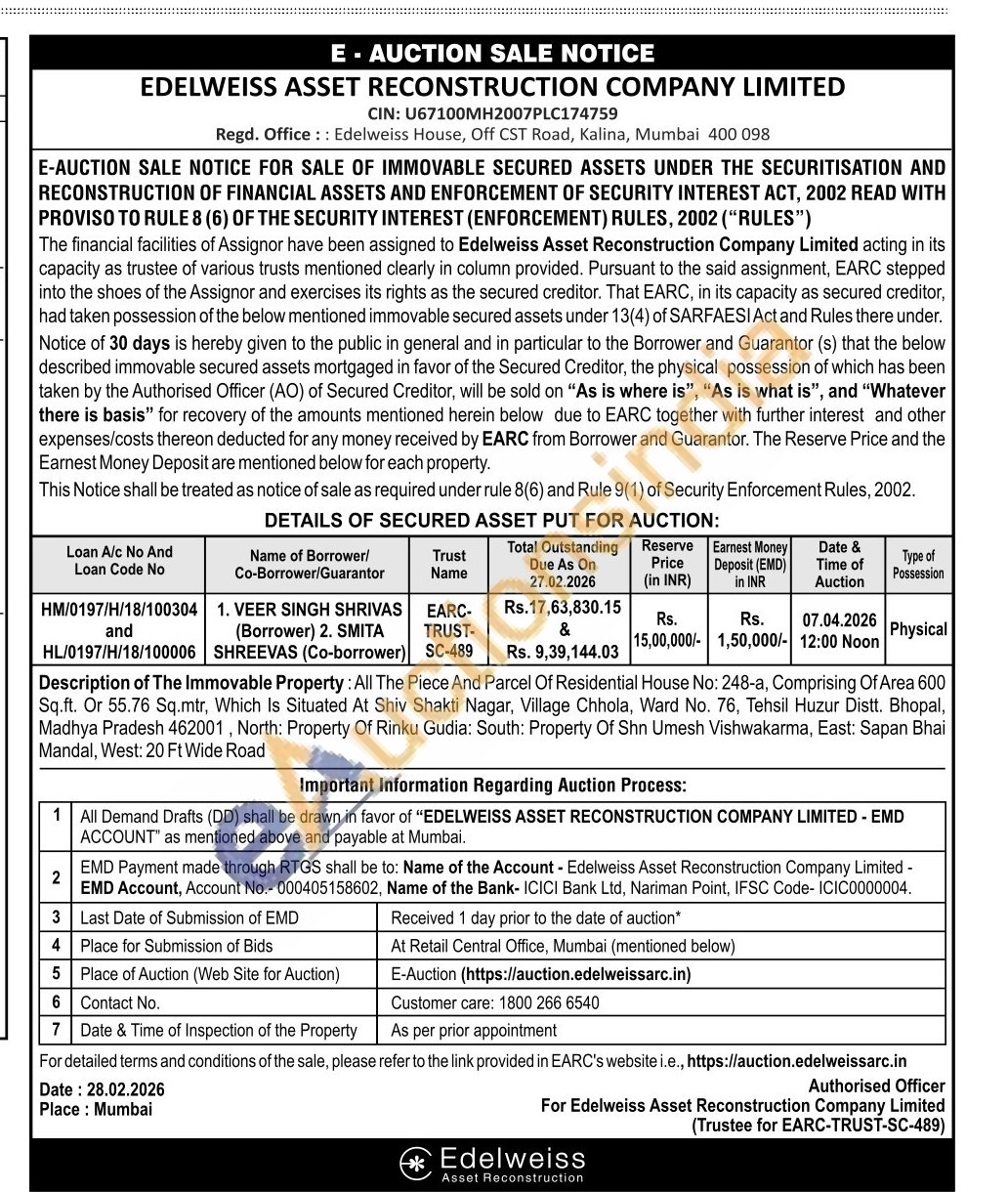 Description of The Immovable Property: All The Piece And Parcel Of Residential House No: 248-a, Comprising Of Area 600 Sq.ft. Or 55.76 Sq.mtr, Which Is Situated At Shiv Shakti Nagar, Village Chhola, Ward No. 76, Tehsil Huzur Distt. Bhopal, Madhya Pradesh 462001, North: Property Of Rinku Gudia: South: Property Of Shn Umesh Vishwakarma, East: Sapan Bhai Mandal, West: 20 Ft Wide Road