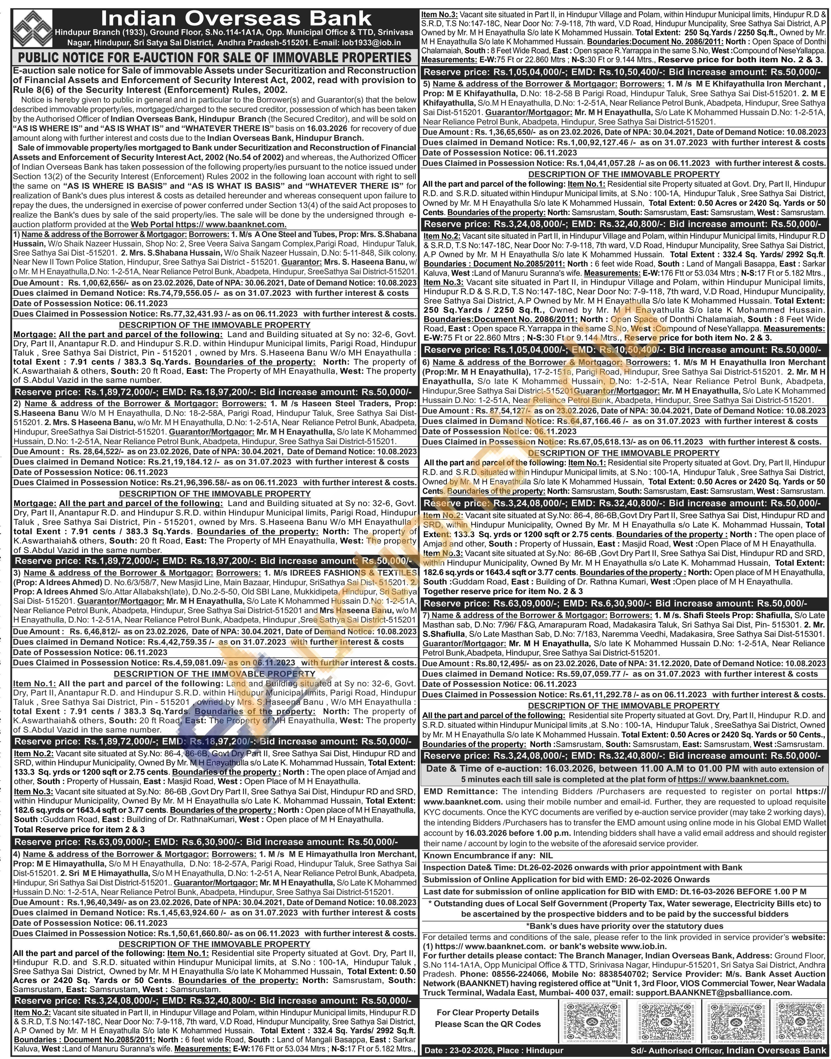 Residential site Property situated at Govt. Dry, Part II, Hindupur R.D. and S.R.D. situated within Hindupur Municipal limits, at S.No: 100-1A, Hindupur Taluk, Sree Sathya Sai District, Owned by Mr. MH Enayathulla S/o late K Mohammed Hussain, Total Extent: 0.50 Acres or 2420 Sq. Yards or 50 Cents. Boundaries of the property: North: Samsrustam, South: Samsrustam, East: Samsrustam, West: Samsrustam