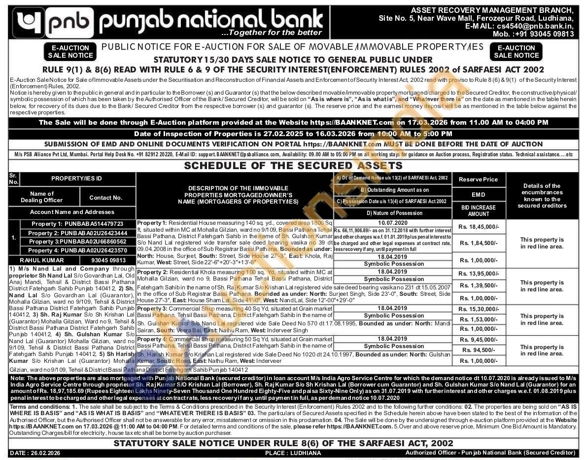 Residential Khola measuring 100 sq. Yd, situated within MC at Mohalla Gilzian, ward no 9, Bassi Pathana Tehsil Bassi Pathana, District Fatehgarh Sahibin the name of Sh. Raj Kumar S/o Krishan Lal registered vide in the office of Sub Registrar Bassi Pathana. Bounded as under: North: House 27'-3", East House Sham Lal, Side 41'-0", West: Nand Lal, Side 12'-00"+29'-0 sale deed bearing vasikano 231 dt 15.05.2007 Surjeet Singh, Side 23'-0", South: Street,