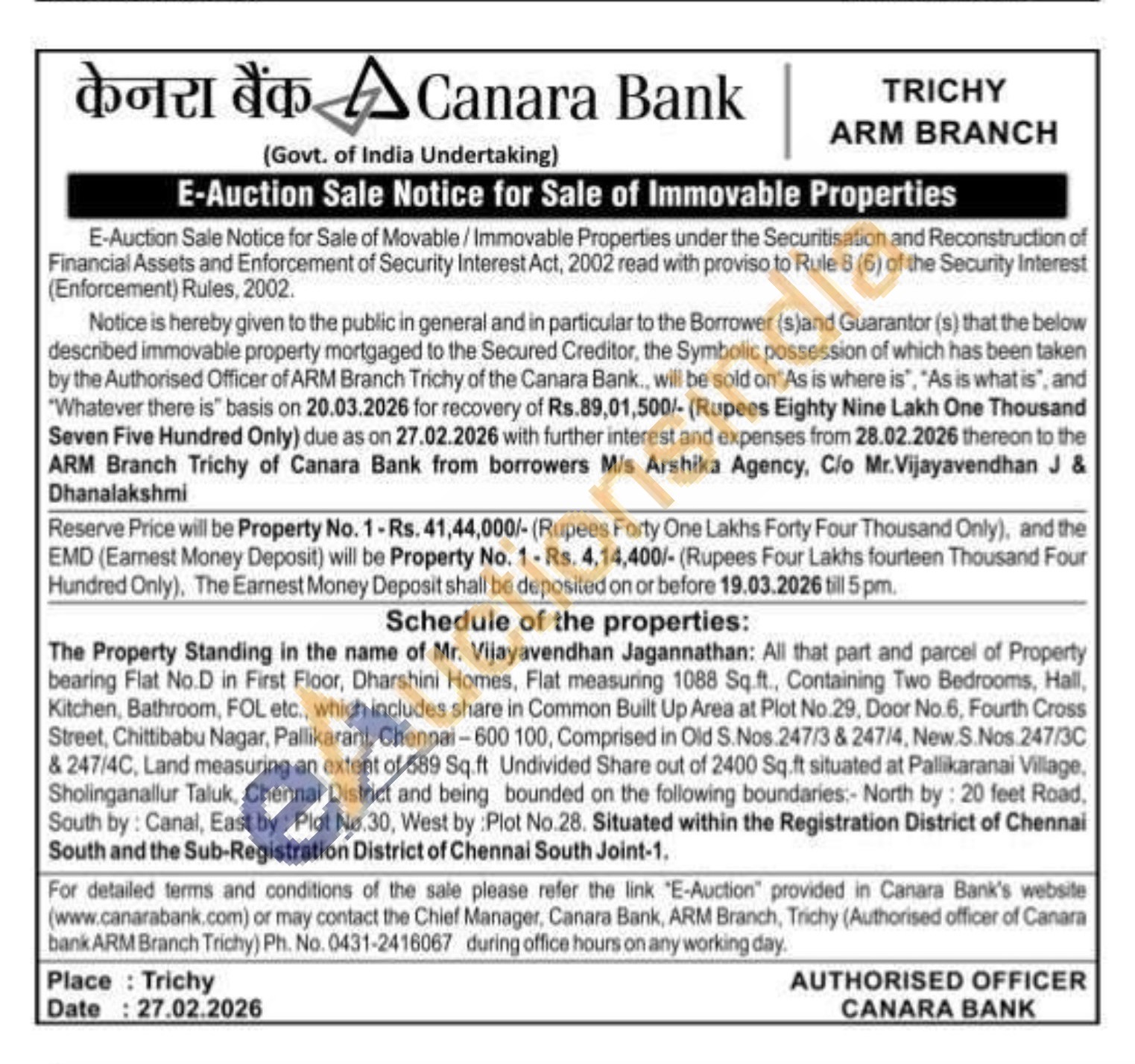The Property Standing in the name of Mr. Vijayavendhan Jagannathan: All that part and parcel of Property bearing Flat No.D in First Floor, Dharshini Homes, Flat measuring 1088 Sq.ft., Containing Two Bedrooms, Hall, Kitchen, Bathroom, FOL etc., which includes share in Common Built Up Area at Plot No.29, Door No.6, Fourth Cross Street, Chittibabu Nagar, Pallikarani, Chennai-600 100, Comprised in Old S. Nos.247/3 & 247/4, New. S.Nos.247/3C & 247/4C, Land measuring an extent of 589 Sq.ft Undivided Share out of 2400 Sq.ft situated at Pallikaranai Village, Sholinganallur Taluk, Chennai District and being bounded on the following boundaries:- North by: 20 feet Road, South by: Canal, East by: Plot No.30, West by : Plot No.28. Situated within the Registration District of Chennai South and the Sub-Registration District of Chennai South Joint-1.