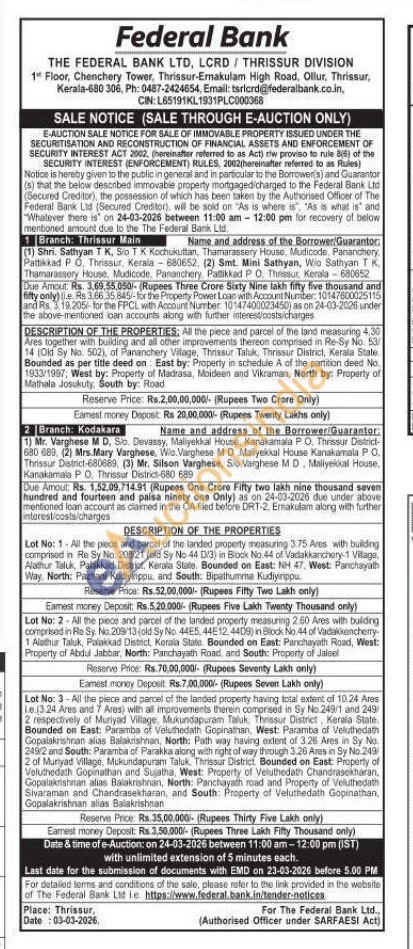 Lot No: 3-All the piece and parcel of the landed property having total extent of 10.24 Ares Le.13.24 Ares and 7 Ares) with all improvements therein comprised in Sy No.249/1 and 249/2 respectively of Muriyad Village, Mukundapuram Taluk, Thrissur District, Kerala State Bounded on East: Paramba of Veluthedath Gopinathan, West: Paramba of Veluthedath Gopalakrishnan alias Balakrishnan, North: Path way having extent of 3.26 Ares in Sy No. 249/2 and South: Paramba of Parakka along with right of way through 3.26 Ares in Sy No.249 2 of Muriyad Village, Mukundapuram Taluk, Thrissur District Bounded on East: Property of Veluthedath Gopinathan and Sujatha, West: Property of Veluthedath Chandrasekharan, Gopalakrishnan alias Balakrishnan, North: Panchayath road and Property of Veluthedath Sivaraman and Chandrasekharan, and South: Property of Veluthedath Gopinathan, Gopalakrishnan alias Balakrishnan