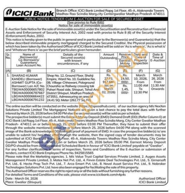 Shop No. 12, Ground Floor, Shahj Empire, Ward No. 10, Guideline No. 08. Villoge-Chhawani, Pologround Chouraha se Railway crossing tak Pohori Road side, Shivpuri, Tehsil And District Shivpuri, Madhya Pradesh 473551. Admeasuring an area of 24.41 SQ. Meter (262.77 Sq. Fit