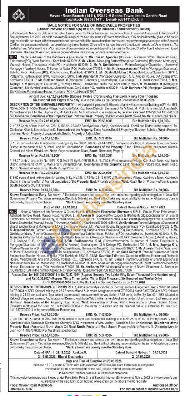 3) 13.25 cents of land with residential building in Sy No. 128/1, RS No. 23-14-519/2, Panniyankara Village, Kozhikode Taluk, Kozhikode District in the name of Mr. V. Mani and Mr. Unnikrishnan. Boundaries of the Property: East: Thekkekeeram pallipadamı nilam & Choorakkod Nilam West: Lane, North: Vayanattupadam Nilam, South: Remaining Property