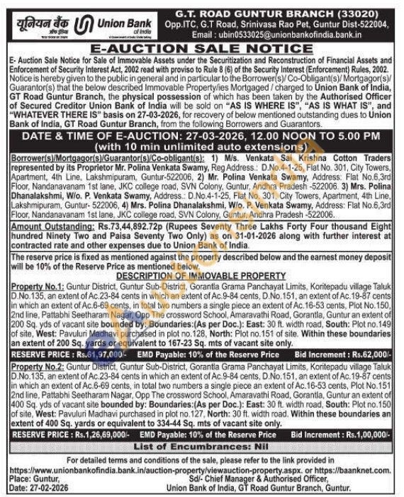Property No.1: Guntur District, Guntur Sub-District, Gorantla Grama Panchayat Limits, Koritepadu village Taluk D.No.135, an extent of Ac.23-84 cents in which an extent of Ac. 9-84 cents, D.No. 151, an extent of Ac. 19-87 cents in which an extent of Ac.6-69 cents, in total two numbers a single piece an extent of Ac. 16-53 cents, Plot No. 150, 2nd line, Pattabhi Seetharam Nagar, Opp The crossword School, Amaravathi Road, Gorantla, Guntur an extent of 200 Sq. yds of vacant site bounded by: Boundaries: (As per Doc.): East: 30 ft. width road, South: Plot no.149 of site, West: Pavuluri Madhavi purchased in plot no. 128, North: Plot no.151 of site. Within these boundaries an extent of 200 Sq. yards or equivalent to 167-23 Sq. mts of vacant site only.