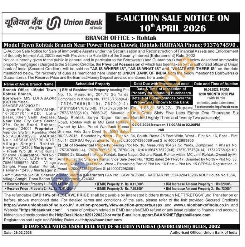 EM of Residential Property bearing Plot No. 16, Measuring 184.27 Sq Yards, Comprised in Khasra No. 17573/7668(0-4), 17576/7669(5-19), 7670(0-2), 16161/15647/7672(0-8), 17570/7676(0-14), 17572/7680(2-10), 7686(0-2), Situated in Mouja Rohtak, Surya Nagar, Gohana Road, Rohtak with in MC Limit Rohtak, Owned by Mr. Amit Kumar Sio Sharvan Kumar, Vide Sale Deed No. 10282 dated 24-11-2017, Bounded by North-Plot No. 33, South- Rasta 25 Feet Wide, West - Remaining Part of Plot No. 16 East-Plot No. 15 CERSAI Registration Id: Asset id 200074384802 and Sl id 400072983661