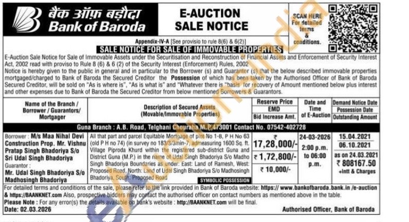All that part and parcel Equitable Mortgage of plot No 1-8, P H No 63 (old P H no 74) (in survey no 183/3/3min-7, admeasuring 1600 Sq. ft. Village Piproda Khurd within the registered sub-district Guna and District Guna (M.P.) in the name of Udal Singh Bhadoriya S/o Madho Singh Bhadoriya Boundaries as under: East: Land of Ramesh, West: Proposed Road, North: Land of Udal Singh Bhadoriya S/o Madhosingh Bhadoriya, South: Proposed Road