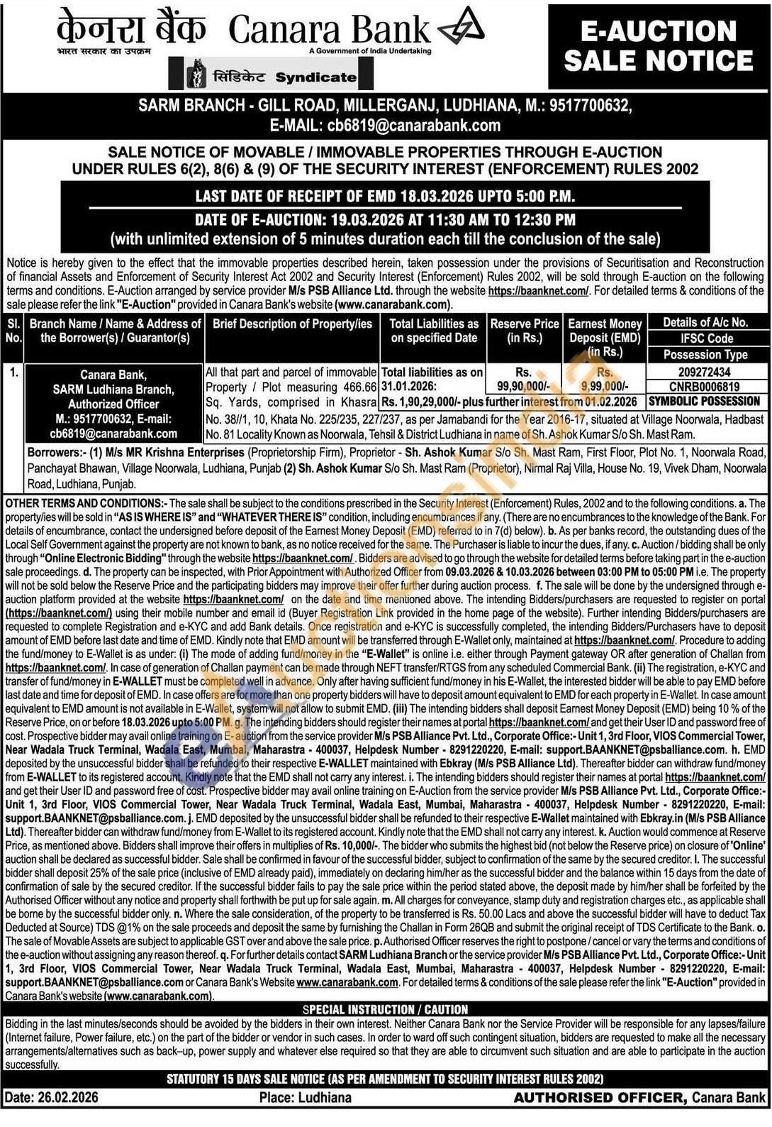All that part and parcel of immovable Property/Plot measuring 466.66 Sq. Yards, comprised in Khasra No. 38//1, 10, Khata No. 225/235, 227/237, as per Jamabandi for the Year 2016-17, situated at Village Noorwala, Hadbast No. 81 Locality Known as Noorwala, Tehsil & District Ludhiana in name of Sh. Ashok Kumar S/o Sh. Mast Ram