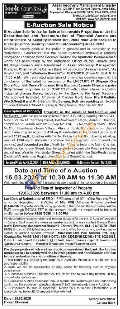 Property in the name of Smt Radhika and Sri.Senthil: All that piece and parcel of land & Building bearing old no.34A. New door No.44, Kamaraj Street, Baktavatsalam Nagar, Alandur, Chennai, comprised in Grama natham Survey No. 124, T.S.No.250/1 & 250/2, Block No.2 of Thalakanancherry Village, Alandur Taluk, Kancheepuram District land measuring an extent of 450 sq.ft., undivided share of land out of total extent 2325 sq.ft., together with Flat No. F-2, in the first floor, having a built up area of 1350 sq.ft. (including common area along with one covered car parking) and bounded on the North by: Property belong to Mani Chettiar, South by: Kamarajar Street, East by: property Belonging to Rajaveni Naicker and others. West by: Kamarajar Street. Situated within the Sub-Registration District of Alandur and Registration District of South Chennai.