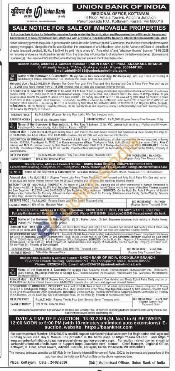 DESCRIPTION OF IMMOVABLE PROPERTY: An extent of 2.43 Ares of land, building and all other improvements thereon comprised in Survey Number. 1246/2/1, Thandapper No TM-5210 of Kumaramangalam Village, Thodupuzha Taluk, idukk: District held in the name of Mrs. Rinu V Lukose and Mr.V. C. Lukose covered by Sale Deed No 1204/2018 dated 29.05.2018 of Thodupuzha Sub Registrar Office BOUNDARIES On the North By: Properties of vilaparambil Joji On the East By: Property of Sinu Vellimangalam On the South By Priville Road On the West By: Property of Vayambadathu.