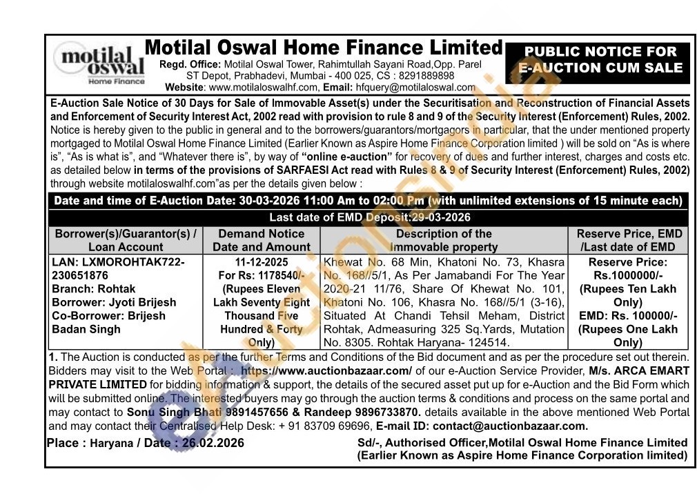 Khewat No. 68 Min, Khatoni No. 73, Khasra No. 168//5/1, As Per Jamabandi For The Year 2020-21 11/76, Share Of Khewat No. 101, Khatoni No. 106, Khasra No. 168//5/1 (3-16), Situated At Chandi Tehsil Meham, District Rohtak, Admeasuring 325 Sq. Yards, Mutation No. 8305. Rohtak Haryana- 124514.