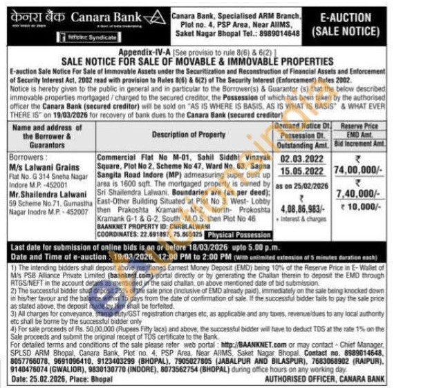 Commercial Flat No M-01, Sahil Siddhi Vinayak Square, Plot No 2. Scheme No 47, Ward No. 63, Sapna Sangita Road Indore (MP) admeasuring super built up area is 1600 sqft. The mortgaged property is owned by Sri Shailendra Lalwani. Boundaries are (as per deed); East-Other Building Situated at Plot No 3. West- Lobby then Prakoshta Kramank M-2. North Prokoshta Kramank G-1 & G-2. South -M.OS. then Plot No 46 BAANKNET PROPERTY ID: CHRBLALWANI