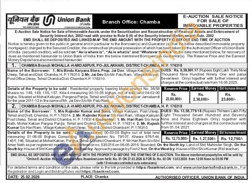 Details of the Property to be sold: Land measuring 00-03-05 Bighs out of total land measuring 01-06-00 Bighas Comprising in Khata khatoni No. 79/107, Khasra 676/1 44, 145/1, 146, Situated at Mohal Kakian, Pargna, Tehsil & District ChambaH. P. Mr Hari Ram S/o Shri Amar Nath as per registered mortgage deed reference no. 535/21 6 on 06-05-2016. Bounded, On South by: House of Shri Kamal Kishor, On the Eastby: Approach passage by Foot 2 feet, On the Westby: House of Shri Shiv Kumar (Rtd teacher)