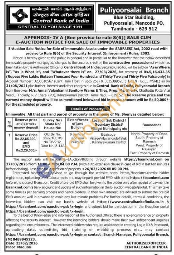 Survey No Khata No/House No:Old Sy No. No. 96/282, Door No. 8-14A 3892/1C, RS Extent/Areas of land Building 6 cents of land and building Location Sub District/Boundary District/Village/ Municipality etc Edaicode Village Vilavancode Taluk Kanniyakumari District