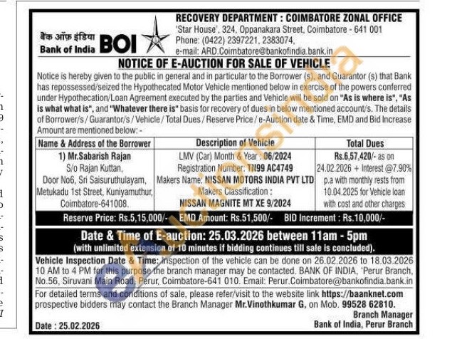 LMV (Car) Month & Year: 06/2024 Registration Number: TN99 AC4749 1 S S Makers Name: NISSAN MOTORS INDIA PVT LTD Makers Classification: NISSAN MAGNITE MT XE 9/2024