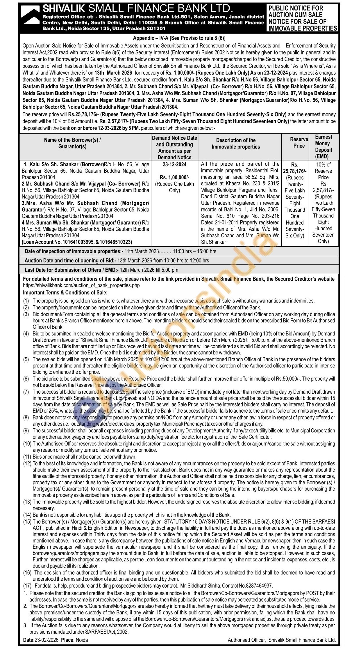 All the piece and parcel of the immovable property: Residential Plot measuring an area 58.52 Sq. Mtrs. Vilage Behlolpur Pargana and Tehsil Dadri District Gautam Buddha Nagar Uttar Pradesh. Registered in revenue records of Bath No. 1, Jild No. 3006. Serial No. 610 Page No. 203-216 Dated 21-01-2011 Property registered in the name of Mrs. Asha Wio Me Subhash Chand and Mrs. Suman Wo Sh. Shankar stuated at Khasra No. 230 & 231/2