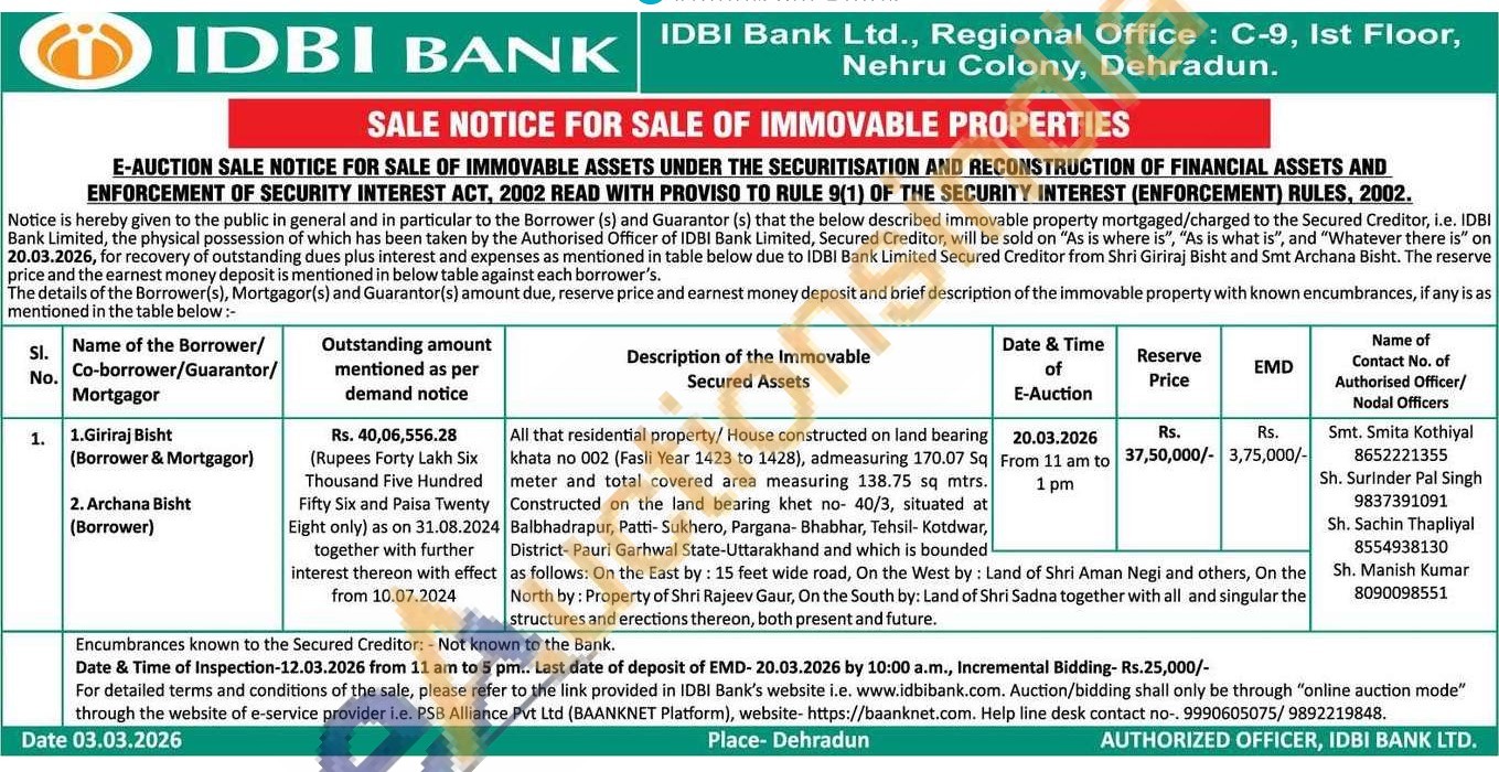 All that residential property/ House constructed on land bearing khata no 002 (Fasli Year 1423 to 1428), admeasuring 170.07 Sq meter and total covered area measuring 138.75 sq mtrs. Constructed on the land bearing khet no- 40/3, situated at Balbhadrapur, Patti-Sukhero, Pargana- Bhabhar, Tehsil-Kotdwar, District-Pauri Garhwal State-Uttarakhand and which is bounded as follows: On the East by: 15 feet wide road, On the West by: Land of Shri Aman Negi and others, On the North by: Property of Shri Rajeev Gaur, On the South by: Land of Shri Sadna together with all and singular the structures and erections thereon, both present and future.