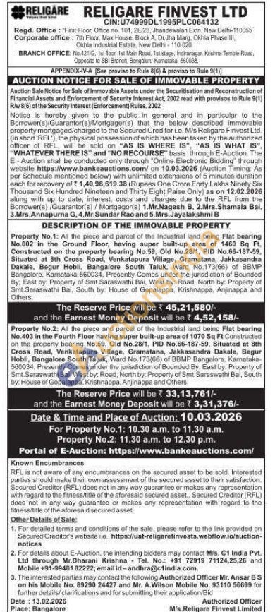 Property No.1: All the piece and parcel of the Industrial land being Flat bearing No.002 in the Ground Floor, having super built-up area of 1460 Sq Ft. Constructed on the property bearing No.59, Old No.28/1, PID No.66-187-59, Situated at 8th Cross Road, Venkatapura Village, Gramatana, Jakkasandra Dakale, Begur Hobli, Bangalore South Taluk, Ward No.173(66) of BBMP Bangalore, Karnataka-560034, Presently Comes under the jurisdiction of Bounded By, East by: Property of Smt Saraswathi Bai, West by: Road, North by: Property of Smt. Saraswathi Bai, South by: House of Gopalappa, Krishnappa, Anjinappa and Others.