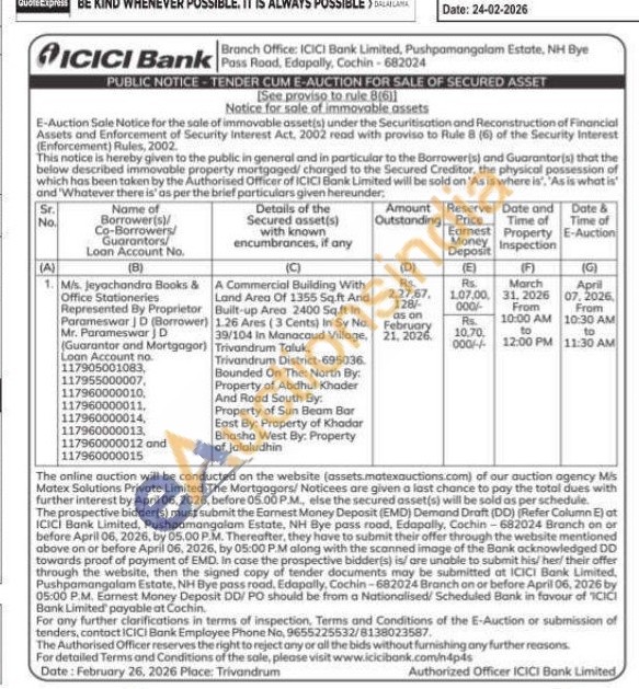 A Commercial Building With Land Area Of 1355 Sq.ft And Built-up Area 2400 Sq.ft in 1.26 Ares (3 Cents) in Sy No. 39/104 in Manacaud Village, Trivandrum Taluk. Trivandrum District-695036 Bounded On The: North By: Property of Abdhul Khader And Road South By: Property of Sun Beam Bar East By: Property of Khadar Bhasha West By: Property of Jalaludhin