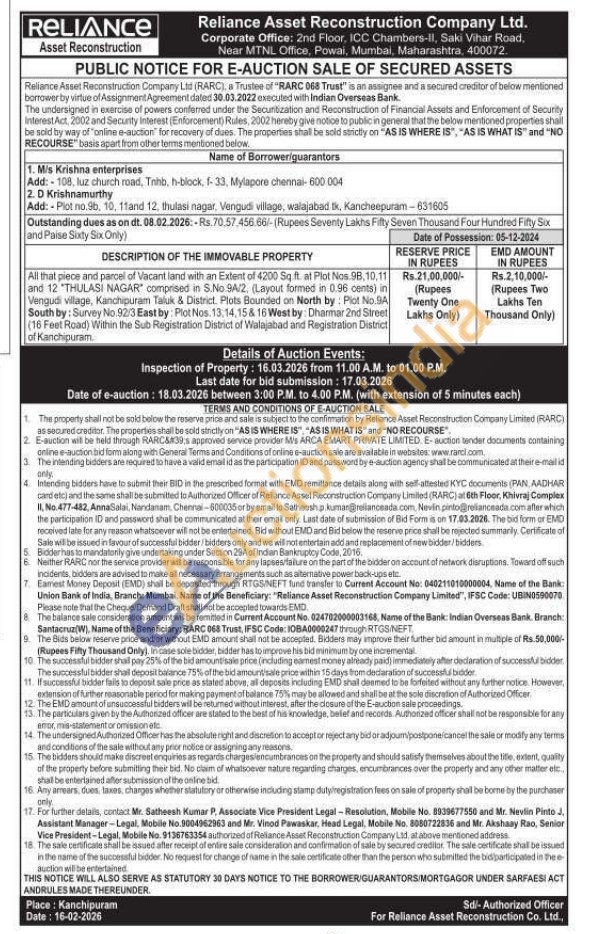 All that piece and parcel of Vacant land with an Extent of 4200 Sq. ft. at Plot Nos 98,10,11 and 12 "THULASI NAGAR" comprised in S.No 9A/2, (Layout formed in 0.96 cents) in Vengudi village, Kanchipuram Taluk & District. Plots Bounded on North by: Plot No.BA South by: Survey No.92/3 East by: Plot Nos. 13,14,15 & 16 West by: Dharmar 2nd Street (16 Feet Road) Within the Sub Registration District of Walajabad and Registration District of Kanchipuram