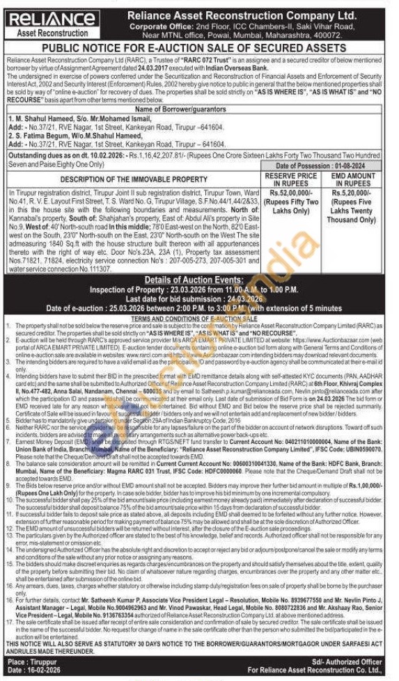 In Tirupur registration district, Tirupur Joint II sub registration district, Tirupur Town, Ward No.41, R. V. E. Layout First Street, T. S. Ward No. G. Tirupur Village, S.F. No. 44/1,44/2833 in this the house site with the following boundaries and measurements. North of Kannabal's property, South of: Shahjahan's property, East of: Abdul Ali's property in Site No.9, West of. 40' North-south road In this middle; 78'0 East-west on the North, 820 East-west on the South, 23'0" North-south on the East, 23'0" North-south on the West The site admeasuring 1840 Sq.ft with the house structure built thereon with all appurtenances thereto with the right of way etc. Door No's 23A, 23A (1), Property tax assessment Nos. 71821, 71824, electricity service connection No's: 207-005-273, 207-005-301 and water service connection No. 111307