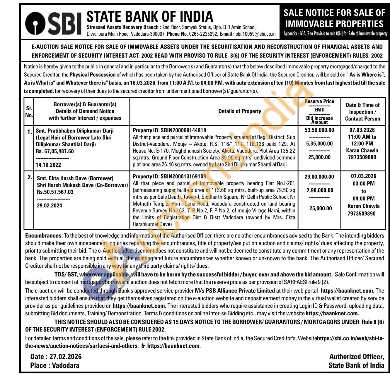 All that piece and parcel of immovable property bearing Flat No.1-201 (admeasuring super built-up area of 115.66 sq mtrs, built-up area 79.50 sq mtrs as per Sale Deed), Tower-I, Siddharth Square, Nr Delhi Public School, Nr Motnath Temple, Harni-Dena Road, Vadodara constructed on land bearing Revenue Survey No.162, T. P. No.2, F. P. No.2, of mouje Village Harni, within the limits of Registration Dist & Distt Vadodara (owned by Mrs. Ekta Harshkumar Dave)