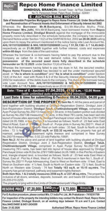 DESCRIPTION OF THE PROPERTY: Item No. 1: All the piece and parcel of land together with building situated at Dindigul Registration District, Dindigul Joint 2 Sub-Registration District, Dindigul Taluk, Chettinaickenpatti Village, comprised in Ayan Punjai Survey No 292/13 measuring 1.59 acre, in this Eastem portion sub-divided as Survey No.292/138 measuring 1.57 acre, in this West 78% cents, has been laid into layout of house sites approved by Dindigul Panchayat Union vide R.Dis No.2781/1989 dated 24.05, 1989, in this Plot No.5 is bounded as follows: North of 23 feet wide East West A Road, East of Plot No.4, South of Punjai plots in Survey No.292/11, West of Plot No.6 Admeasuring, East to West on both sides: 33 feet, South to North on both sides 72% feet, Totally 2393 sq.ft. or 222.32 sq.mtrs. The property has got all mamool, pathway and easement rights thereon and comprised in New Survey No. 292/19 measuring Hec. 0.02.22 vide Patta No. 10691,