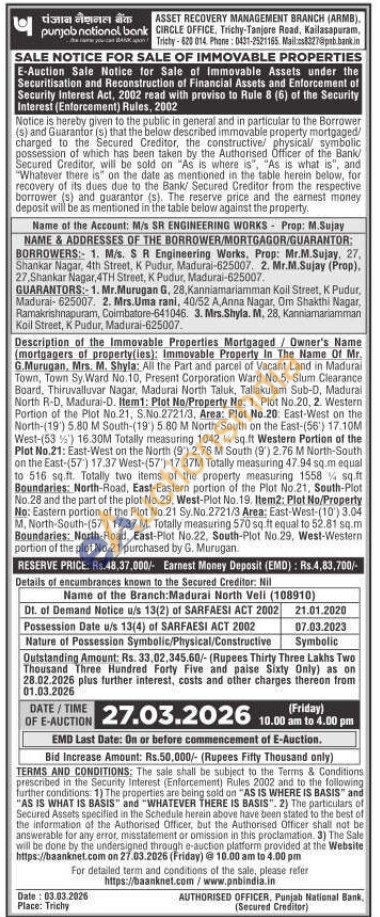 G.Murugan, Mrs. M. Shyla: All the Part and parcel of Vacant Land in Madurai Town, Town Sy. Ward No.10, Present Corporation Ward No.5, Slum Clearance Board, Thiruvalluvar Nagar, Madurai North Taluk, Tallakulam Sub-D, Madural North R-D, Madurai-0. Item1: Plot No/Property No: 1. Plot No.20, 2. Western Portion of the Plot No.21, S.No. 2721/3, Area: Plot No.20. East-West on the North-(19) 5.80 M South-(19) 5.80 M North-South on the East-(56') 17.10M West-(53%) 16.30M Totally measuring 1042 sq.ft Western Portion of the Plot No.21: East-West on the North (9) 2.76 M South (9') 2.76 M North-South on the East-(57) 17.37 West-(57') 17.37M Totally measuring 47.94 sq.m equal to 516 sq.ft. Totally two items of the property measuring 1558 1/4 sq.ft Boundaries: North-Road, East-Eastern portion of the Plot No.21, South-Plot No.28 and the part of the plot No.29, West-Plot No. 19. Item2: Plot No/Property No: Eastern portion of the Plot No.21 Sy.No. 2721/3 Area: East-West-(10') 3.04 M. North-South-(57) 17.37 M. Totally measuring 570 sq.ft equal to 52.81 sq.m Boundaries: North-Road, East-Plot No.22, South-Plot No.29, West-Western portion of the plot No.21 purchased by G. Murugan