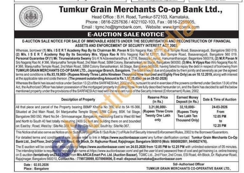 All that piece and parcel of the Property bearing BBMP Khatha No 366, and its 54-16-366, Situated at 2nd Main Road, Sri Manjunatha Temple Street, SBM Colony, BSK 1st Stage, Bangalore 560 050, Ward No.54-Srinivasanagar, Bangalore, measuring East to West 60 feet and North to South 40 feet totally measuring 2400 Sq feet and building there on and bounded on: East by: Road, West by: Site No. 359, North by: Site No. 365, South by: Site No 367