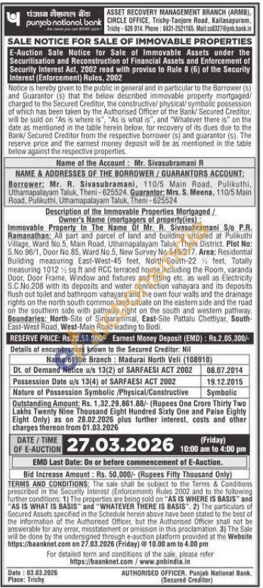 Description of the Immovable Properties Mortgaged/Owner's Name (mortgagers of property(ies): Immovable Property In The Name Of Mr. R. Sivasubramani S/ P.R Ramanathan: All part and parcel of land and building situated at Pulikuthi Village, Ward No.5, Main Road, Uthamapalayam Taluk, Theni District. Plat No: S.No.96/1, Door No. 85, Ward No.5, New Survey No.549/217, Area: Residential Building measuring East-West-45 feet, North-South-22 feet, Totally measuring 1012 sq.ft and RCC terraced house including the Room, varanda Door, Door Frame, Window and fixtures and fitting etc. as well as Electricity S.C.No.208 with its deposits and water connection vahayara and its deposits flush out toilet and bathroom vahayara and the own four walls and the drainage rights on the north south common land situate on the eastern side and the road on the southern side with pathway right on the south and western pathway. Boundaries: North-Site of Singarammal, East-Site Pattalu Chettiyar, South-East-West Road, West-Main Road leading to Bodi