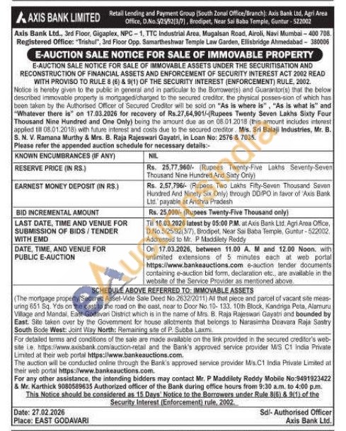 All that piece and parcel of vacant site meas uring 851 Sq. Yds on the east to the road on the east, near to Door No. 10-133. 10th Block, Kandriga Peta, Alamuru Village and Mandal, East Godavari District which is in the name of Mrs. B. Raja Rajeswan Gayatri and bounded by East. Site taken over by the Govemment for house allotments that belongs to Narasimha Deavara Raja Sastry South Bode West: Joint Way North: Remaining site of P. Subba Laxmi