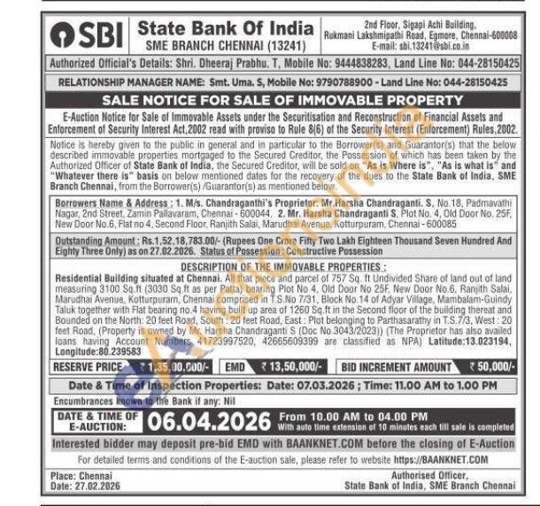 Residential Building situated at Chennai. All that piece and parcel of 757 Sq. It Undivided Share of land out of land measuring 3100 Sq.ft (3030 Sq.ft as per Patta) bearing Plot No 4. Old Door No 25F, New Door No.6, Ranjith Salai, Marudhai Avenue, Kotturpuram, Chennai comprised in T.S.No 7/31, Block No. 14 of Adyar Village, Mambalam-Guindy Taluk together with Flat bearing no.4 having built up area of 1260 Sq.ft in the Second floor of the building thereat and Bounded on the North: 20 feet Road, South: 20 feet Road, East: Plot belonging to Parthasarathy in T.S.7/3, West: 20 feet Road, (Property is owned by Mr. Harsha Chandraganti S (Doc No.3043/2023)) (The Proprietor has also availed loans having Account Numbers 41723997520, 42665609399 are classified as NPA) Latitude: 13.023194, Longitude:80.239583