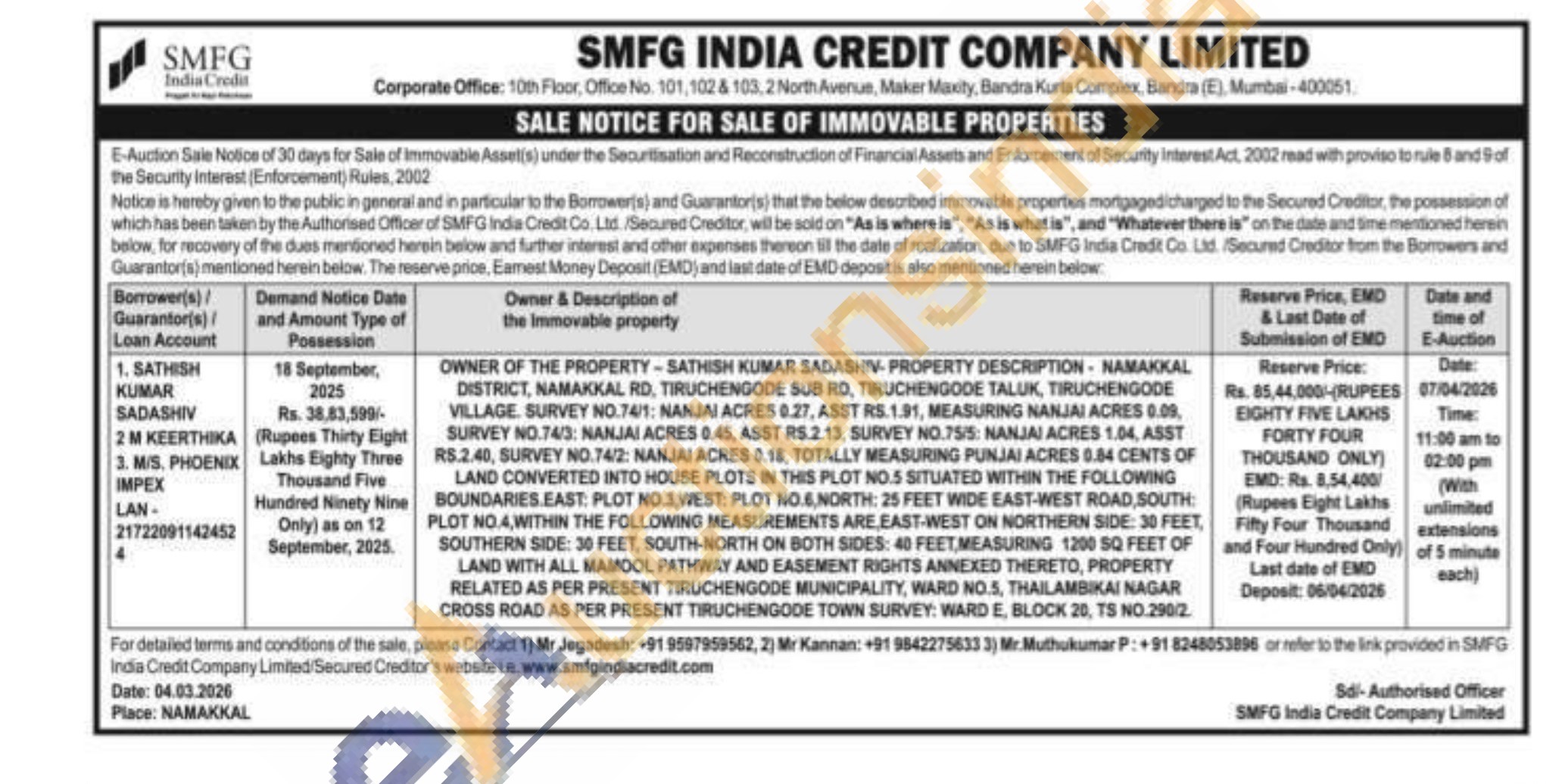 OWNER OF THE PROPERTY-SATHISH KUMAR SADASHIV-PROPERTY DESCRIPTION-NAMAKKAL DISTRICT, NAMAKKAL RD, TIRUCHENGODE SUB RD, TIRUCHENGODE TALUK, TIRUCHENGODE VILLAGE. SURVEY NO.74/1: NANJAI ACRES 0.27, ASST RS.1.91, MEASURING NANJAI ACRES 0.09, SURVEY NO.74/3: NANJAI ACRES 0.45, ASST RS.2.13, SURVEY NO.75/S: NANJAI ACRES 1.04, ASST RS.2.40, SURVEY NO.74/2: NANJAI ACRES 0.15, TOTALLY MEASURING PUNJAI ACRES 0.84 CENTS OF LAND CONVERTED INTO HOUSE PLOTS IN THIS PLOT NO.5 SITUATED WITHIN THE FOLLOWING BOUNDARIES EAST: PLOT NO.3,WEST: PLOT NO.6,NORTH: 25 FEET WIDE EAST-WEST ROAD, SOUTH: PLOT NO. 4, WITHIN THE FOLLOWING MEASUREMENTS ARE EAST-WEST ON NORTHERN SIDE: 30 FEET, SOUTHERN SIDE: 30 FEET, SOUTH-NORTH ON BOTH SIDES: 40 FEET MEASURING 1200 SQ FEET OF LAND WITH ALL MAMOOL PATHWAY AND EASEMENT RIGHTS ANNEXED THERETO, PROPERTY RELATED AS PER PRESENT TIRUCHENGODE MUNICIPALITY, WARD NO.5, THAILAMBIKAI NAGAR CROSS ROAD AS PER PRESENT TIRUCHENGODE TOWN SURVEY: WARD E, BLOCK 20, TS NO.290/