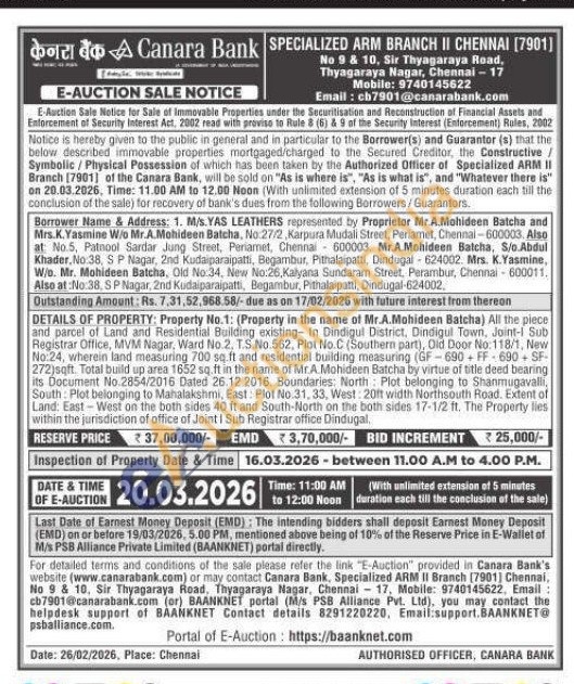 DETAILS OF PROPERTY: Property No.1: (Property in the name of Mr.A.Mohideen Batcha) All the piece and parcel of Land and Residential Building existing In Dindigul District, Dindigul Town, Joint-1 Sub Registrar Office, MVM Nagar, Ward No.2, T.S.No.562, Plot No.C (Southern part), Old Door No: 118/1, New No:24, wherein land measuring 700 sq.ft and residential building measuring (GF-690FF 690+SF-272)sqft. Total build up area 1652 sq ft in the name of Mr.A. Mohideen Batcha by virtue of title deed bearing its Document No.2854/2016 Dated 26.12.2016. Boundaries: North Plot belonging to Shanmugavalli, South: Plot belonging to Mahalakshmi, East: Plot No.31, 33, West: 20ft width Northsouth Road. Extent of Land: East-West on the both sides 40 ft and South-North on the both sides 17-1/2 ft. The Property lies within the jurisdiction of office of Joint | Sub Registrar office Dindugal,