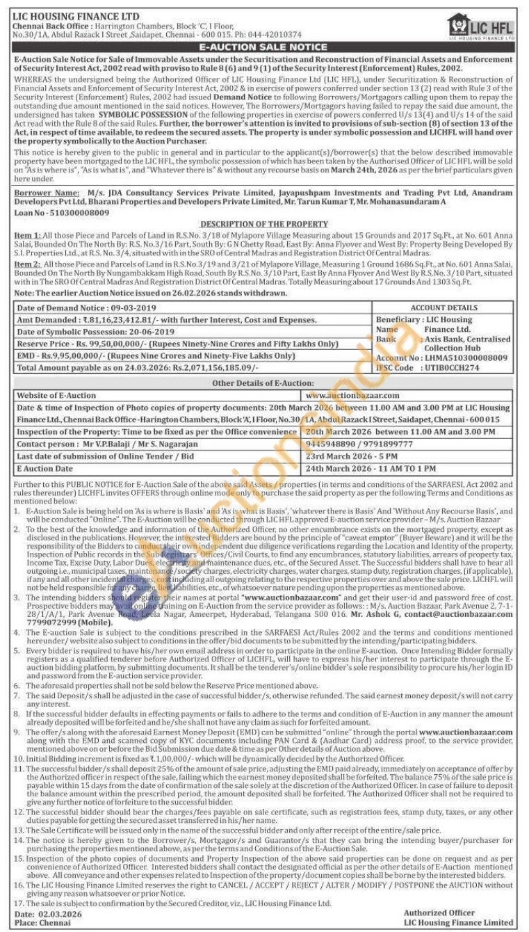 DESCRIPTION OF THE PROPERTY : Loan No-510300008009 : Item 1: All those Piece and Parcels of Land in R.S.No. 3/18 of Mylapore Village Measuring about 15 Grounds and 2017 Sq.Ft., at No. 601 Anna Salai, Bounded On The North By: R.S. No.3/16 Part, South By: G N Chetty Road, East By: Anna Flyover and West By: Property Being Developed By S.I. Properties Ltd., at R.S. No. 3/4, situated with in the SRO of Central Madras and Registration District Of Central Madras.