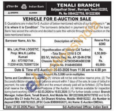 Hypothecation of Vehicle (Oil Tanker) -Tata Signa (3518 S CR BS IV), Vehicle Reg. No. AP-39-W-5706 Chassis Number: AT503054KAB03398 Engine No. 91484853008