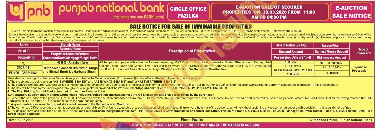 All that part and parcel of Residential House measuring 30X45 ie. 1350 Sq. Feet, Situated at Shahid Bhagat Singh Colony, DAV College Road, Jalalabad (West) Distt. Fazika (PB) Owned by Mr. Nirmal Singh Sto Harbans Singh vide RTD No. 2588 Dated Singh 17.08.2011. Bounded: East-Balwinder Singh, West-Prom Tondon, North-Vendor, South-Street