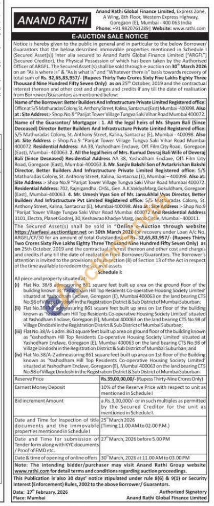 (iv) Flat No 38/A-2 admeasuring 861 square feet built up area on 1st floor of the Building known as Yashodham Hill Top Residents Co-operative Housing Society Limited situated at Yashodham Enclave, Goregaon (E), Mumbai 400063 on the land bearing CTS No.98 of Village Dindoshi in the Registration District & Sub District of Mumbai Suburban