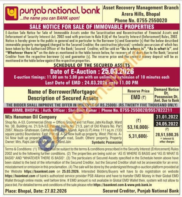 Shop No. A-53, Commercial (Shop + Office) Ground and 1st Floor, Jatni Ka Bagh, Ward No. 38, Building no. 21/3/A-53, Patwari Halka No. 21/3, part of Old Khasra No. Part 2087, Mauza-Ghatvasan, Cahhataward, Jeon, Mandi, Agra (U.P) Area: 111 sq.m. (133) square yards) Boundaries: East: Plot no. A-52 Now built up property, West: Plot no. A-54 Now built up property, North: Common road, South: Others' property. Property Owner: Mrs. Rajni Jain W/o Mr. Satish Chand Jain