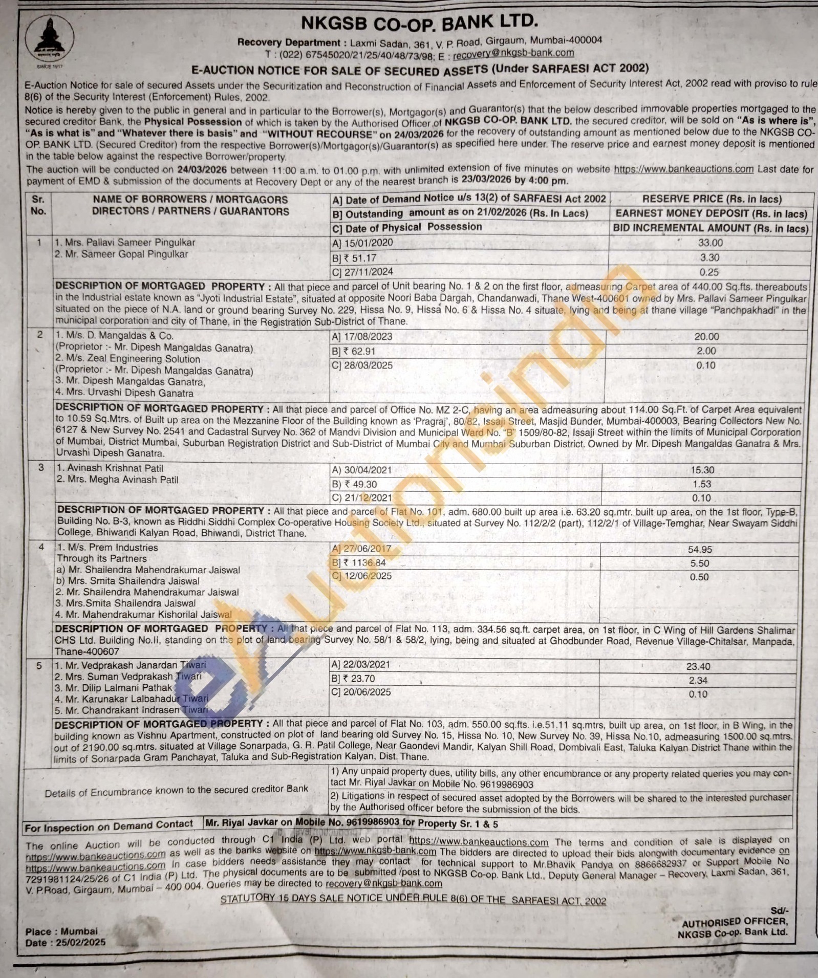 1) All that piece and parcel of Unit bearing No. 1 & 2 on the first floor, admeasuring Carpet area of 440.00 Sq.fts. thereabouts in the Industrial estate known as "Jyoti Industrial Estate", situated at opposite Noori Baba Dargah, Chandanwadi, Thane West-400601 owned by Mrs. Pallavi Sameer Pinguikar situated on the piece of N.A. land or ground bearing Survey No. 229, Hissa No. 9, Hissa No. 6 & Hissa No. 4 situate, lying and being at thane village "Panchpakhadi in the municipal corporation and city of Thane, in the Registration Sub-District of Thane.