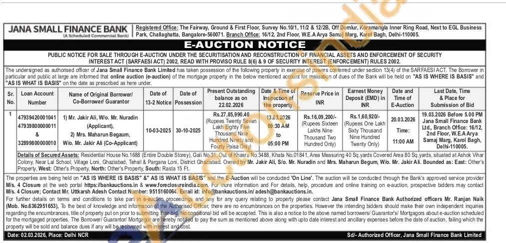 Details of Secured Assets: Residential House No.1688 (Entire Double Storey), Gali No.31, Out of Khasra No.3488, Khata No.01841, Area Measuring 40 Sq.yards Covered Area 80 Sq.yards, situated at Ashok Vihar Colony, Near Lal School, Village Loni, Ghaziabad, Tehsil & Pargana Loni, District Ghaziabad. Owned by Mr. Jakir Ali, S/o. Mr. Nuradin and Mrs. Maharun Begum, W/o. Mr. Jakir Ali. Bounded as: East: Other's Property, West: Other's Property, North: Other's Property, South: Rasta 15 Ft.