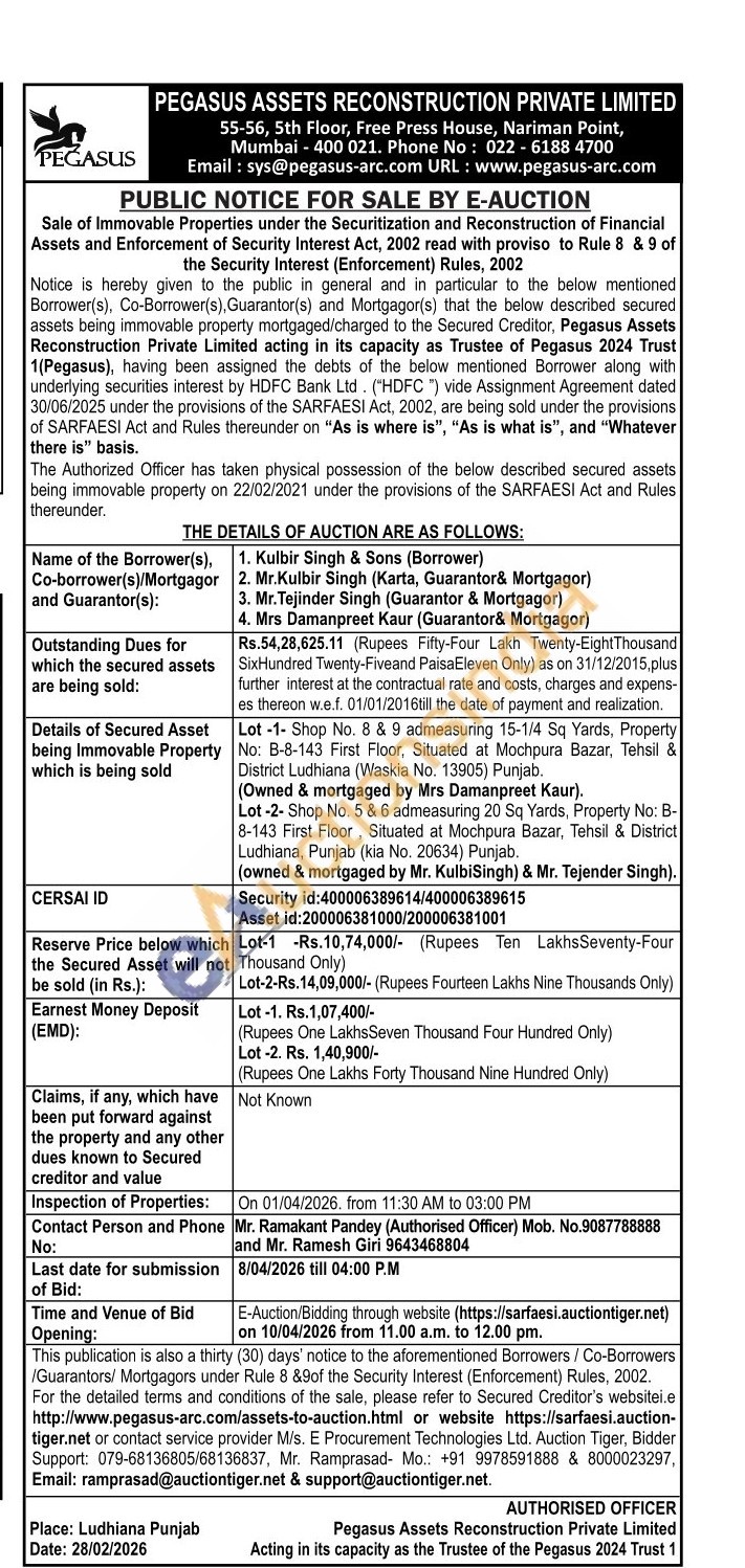 Lot-2- Shop No. 5 & 6 admeasuring 20 Sq Yards, Property No: B-8-143 First Floor, Situated at Mochpura Bazar, Tehsil & District Ludhiana, Punjab (kia No. 20634) Punjab.