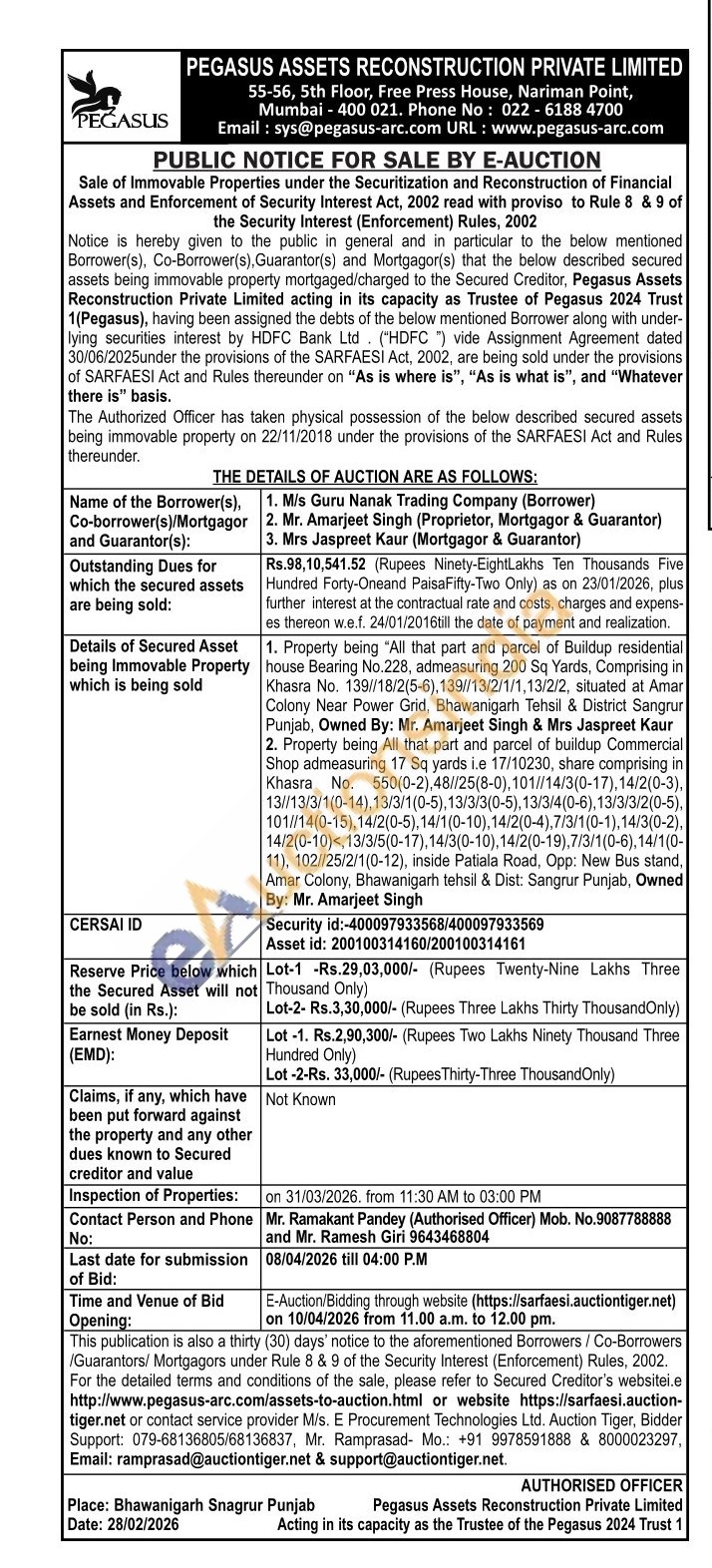 2. Property being All that part and parcel of buildup Commercial Shop admeasuring 17 Sq yards i.e 17/10230, share comprising in Khasra No. 550(0-2),48//25(8-0), 101//14/3(0-17), 14/2(0-3), 13//13/3/1(0-14),13/3/1(0-5), 13/3/3(0-5), 13/3/4(0-6), 13/3/3/2(0-5), 101//14(0-15),14/2(0-5),14/1 (0-10),14/2(0-4),7/3/1 (0-1),14/3(0-2), 14/2(0-10)<,13/3/5(0-17), 14/3(0-10),14/2(0-19),7/3/1(0-6),14/1(0-11), 102//25/2/1(0-12), inside Patiala Road, Opp: New Bus stand, Amar Colony, Bhawanigarh tehsil & Dist: Sangrur Punjab, Owned By: Mr. Amarjeet Singh