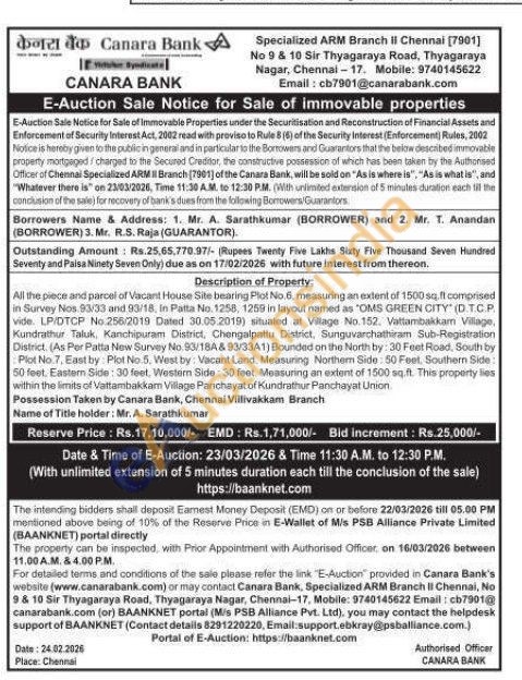 All the piece and parcel of Vacant House Site beating Plot No. 6, measuring an extent of 1500 sq.ft comprised in Survey Nos. 93/33 and 93/18, In Patta No. 1258, 1259 in layout named as 'OMS GREEN CITY (D.TC.P Vide. LP/DTCP No 256/2019 Dated 30.05.2019) situated at Village No. 152. Vattambakkam Village, Kundrathur Taluk, Kanchipuram District, Chengalpattu District, Sunguvarchathiram Sub-Registration District. (As Per Patta New Survey No. 93/18A & 93/33A1) Bounded on the North by: 30 Feet Road, South by Plot No 7. East by Plot No.5, West by: Vacant Land. Measuring Northem Side: 50 Feet, Southern Side: 50 feet. Eastern Side: 30 feet, Western Side: 30 feet. Measuring an extent of 1500 sq.ft. This property lies within the limits of Vattambakkam Village Panchayat of Kundrathur Panchayat Union